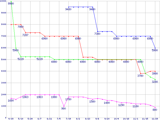 メモリ主要製品(最安値5千円未満)の最安値推移