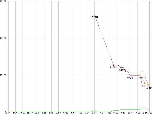 ※このグラフは過去のデータも税率5%相当に調整した税込み相当額のグラフです。 税率変更や、総額表示方式導入(2004年4月)の影響は除いています。 | | | ●凡例 | 最安値 (点線部は販売店未確認 または未調査) | 平均値 | 最高値 | ショップ数 |