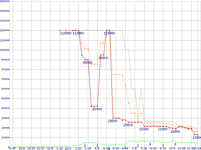 ※このグラフは過去のデータも税率5%相当に調整した税込み相当額のグラフです。 税率変更や、総額表示方式導入(2004年4月)の影響は除いています。 | | | ●凡例 | 最安値 (点線部は販売店未確認 または未調査) | 平均値 | 最高値 | ショップ数 |