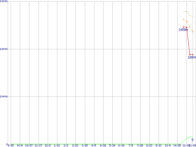 ※このグラフは過去のデータも税率5%相当に調整した税込み相当額のグラフです。 税率変更や、総額表示方式導入(2004年4月)の影響は除いています。 | | | ●凡例 | 最安値 (点線部は販売店未確認 または未調査) | 平均値 | 最高値 | ショップ数 |