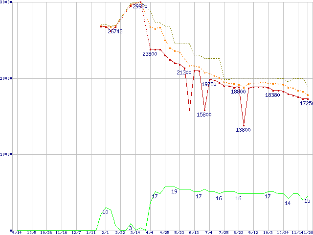 ※このグラフは過去のデータも税率5%相当に調整した税込み相当額のグラフです。 税率変更や、総額表示方式導入(2004年4月)の影響は除いています。 | | | ●凡例 | 最安値 (点線部は販売店未確認 または未調査) | 平均値 | 最高値 | ショップ数 |