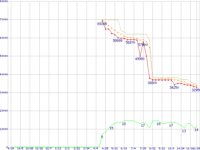 ※このグラフは過去のデータも税率5%相当に調整した税込み相当額のグラフです。 税率変更や、総額表示方式導入(2004年4月)の影響は除いています。 | | | ●凡例 | 最安値 (点線部は販売店未確認 または未調査) | 平均値 | 最高値 | ショップ数 |