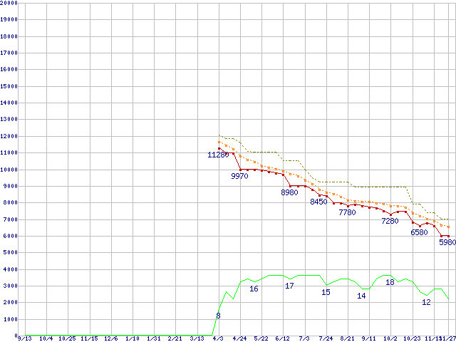 ※このグラフは過去のデータも税率5%相当に調整した税込み相当額のグラフです。 税率変更や、総額表示方式導入(2004年4月)の影響は除いています。 | | | ●凡例 | 最安値 (点線部は販売店未確認 または未調査) | 平均値 | 最高値 | ショップ数 |