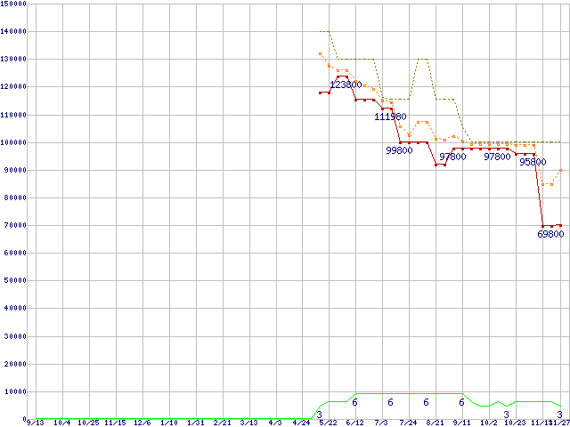※このグラフは過去のデータも税率5%相当に調整した税込み相当額のグラフです。 税率変更や、総額表示方式導入(2004年4月)の影響は除いています。 | | | ●凡例 | 最安値 (点線部は販売店未確認 または未調査) | 平均値 | 最高値 | ショップ数 |