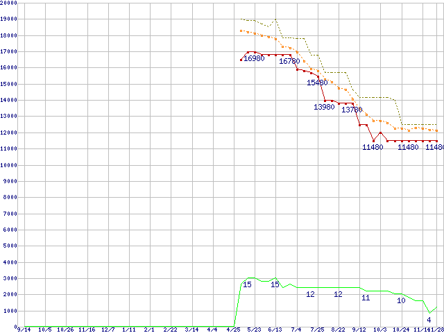 ※このグラフは過去のデータも税率5%相当に調整した税込み相当額のグラフです。 税率変更や、総額表示方式導入(2004年4月)の影響は除いています。 | | | ●凡例 | 最安値 (点線部は販売店未確認 または未調査) | 平均値 | 最高値 | ショップ数 |