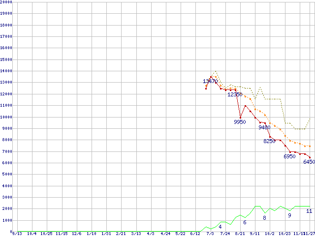 ※このグラフは過去のデータも税率5%相当に調整した税込み相当額のグラフです。 税率変更や、総額表示方式導入(2004年4月)の影響は除いています。 | | | ●凡例 | 最安値 (点線部は販売店未確認 または未調査) | 平均値 | 最高値 | ショップ数 |
