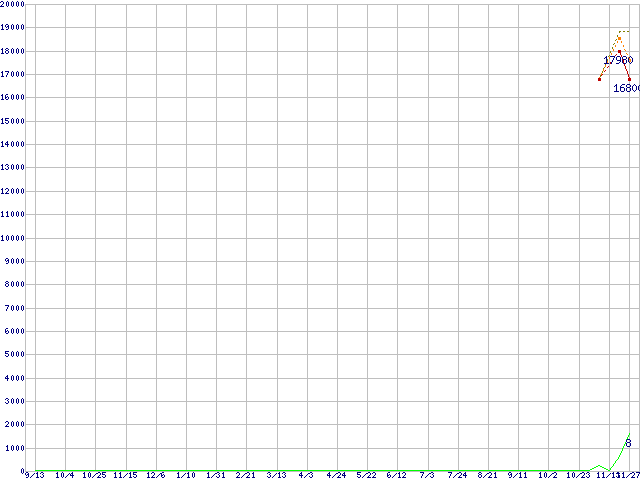 ※このグラフは過去のデータも税率5%相当に調整した税込み相当額のグラフです。 税率変更や、総額表示方式導入(2004年4月)の影響は除いています。 | | | ●凡例 | 最安値 (点線部は販売店未確認 または未調査) | 平均値 | 最高値 | ショップ数 |