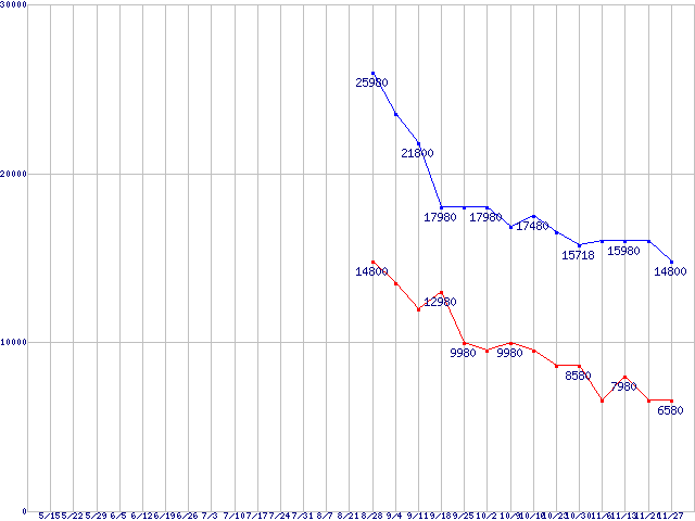 WD Scorpio Blue (5400rpm,3Gb/s,2.5インチ)の最安値推移