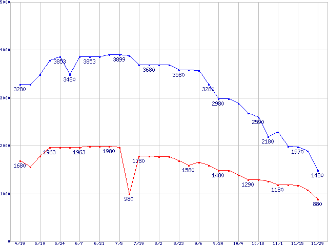 PC2-6400(DDR2-800) 2GB/1GBの最安値推移