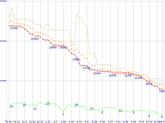 ※このグラフは過去のデータも税率5%相当に調整した税込み相当額のグラフです。 税率変更や、総額表示方式導入(2004年4月)の影響は除いています。 | | | ●凡例 | 最安値 (点線部は販売店未確認 または未調査) | 平均値 | 最高値 | ショップ数 |