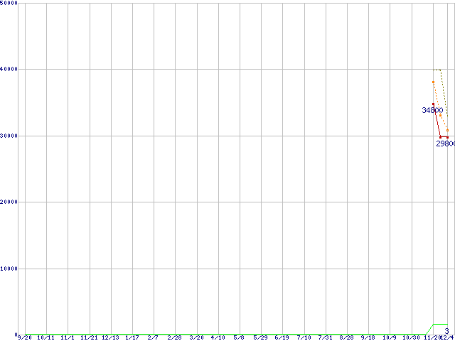 ※このグラフは過去のデータも税率5%相当に調整した税込み相当額のグラフです。 税率変更や、総額表示方式導入(2004年4月)の影響は除いています。 | | | ●凡例 | 最安値 (点線部は販売店未確認 または未調査) | 平均値 | 最高値 | ショップ数 |