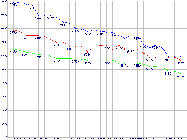 WD Caviar Blue (7200rpm,3Gb/s,16MB)の最安値推移