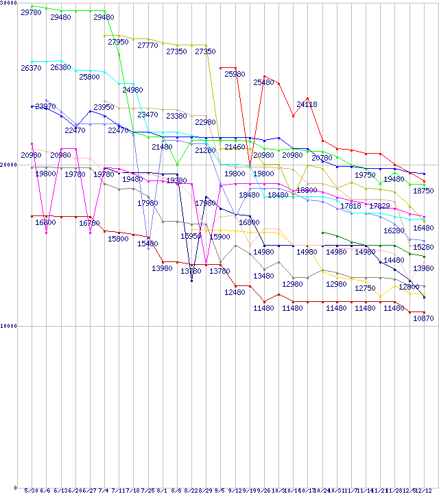 | CPU主要製品(最安値1万円~2万円未満)の最安値推移 | | | (2008年5月30日~2008年12月12日) |
