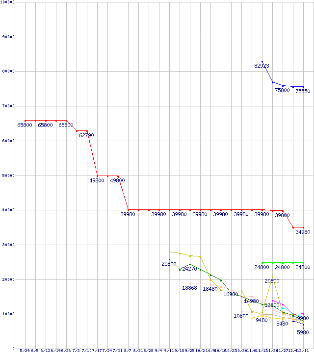 | HDD/SSD 30GB~60GB未満の最安値推移 | | | (2008年5月29日~2008年12月11日) |