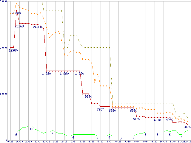 ※このグラフは過去のデータも税率5%相当に調整した税込み相当額のグラフです。 税率変更や、総額表示方式導入(2004年4月)の影響は除いています。 | | | ●凡例 | 最安値 (点線部は販売店未確認 または未調査) | 平均値 | 最高値 | ショップ数 |