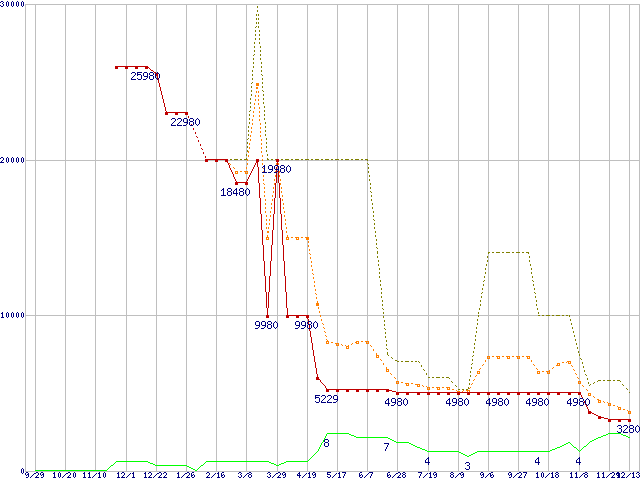 ※このグラフは過去のデータも税率5%相当に調整した税込み相当額のグラフです。 税率変更や、総額表示方式導入(2004年4月)の影響は除いています。 | | | ●凡例 | 最安値 (点線部は販売店未確認 または未調査) | 平均値 | 最高値 | ショップ数 |