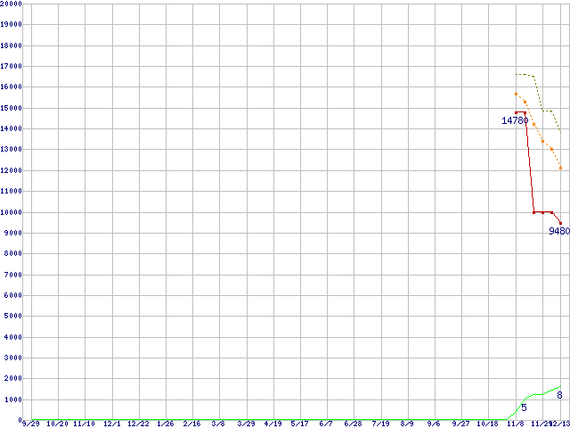 ※このグラフは過去のデータも税率5%相当に調整した税込み相当額のグラフです。 税率変更や、総額表示方式導入(2004年4月)の影響は除いています。 | | | ●凡例 | 最安値 (点線部は販売店未確認 または未調査) | 平均値 | 最高値 | ショップ数 |