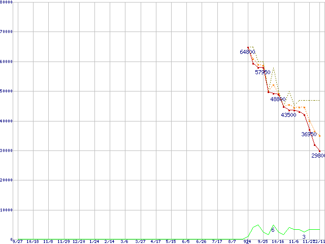 ※このグラフは過去のデータも税率5%相当に調整した税込み相当額のグラフです。 税率変更や、総額表示方式導入(2004年4月)の影響は除いています。 | | | ●凡例 | 最安値 (点線部は販売店未確認 または未調査) | 平均値 | 最高値 | ショップ数 |