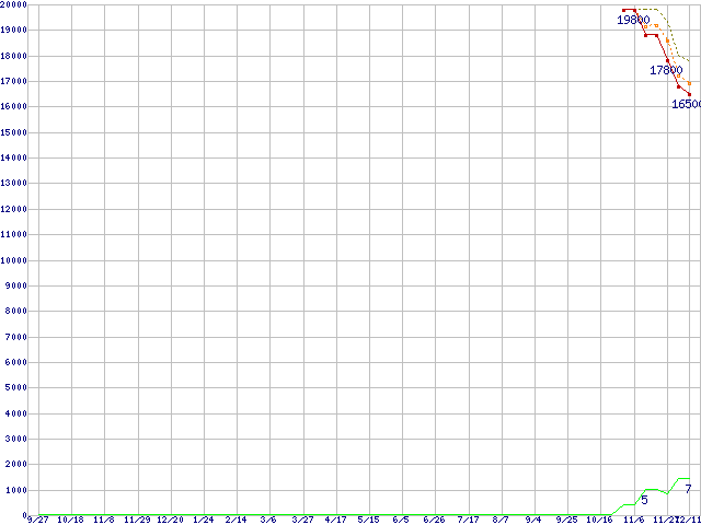 ※このグラフは過去のデータも税率5%相当に調整した税込み相当額のグラフです。 税率変更や、総額表示方式導入(2004年4月)の影響は除いています。 | | | ●凡例 | 最安値 (点線部は販売店未確認 または未調査) | 平均値 | 最高値 | ショップ数 |