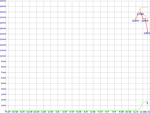 ※このグラフは過去のデータも税率5%相当に調整した税込み相当額のグラフです。 税率変更や、総額表示方式導入(2004年4月)の影響は除いています。 | | | ●凡例 | 最安値 (点線部は販売店未確認 または未調査) | 平均値 | 最高値 | ショップ数 |