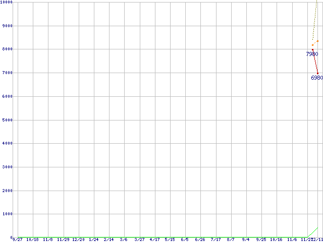 ※このグラフは過去のデータも税率5%相当に調整した税込み相当額のグラフです。 税率変更や、総額表示方式導入(2004年4月)の影響は除いています。 | | | ●凡例 | 最安値 (点線部は販売店未確認 または未調査) | 平均値 | 最高値 | ショップ数 |