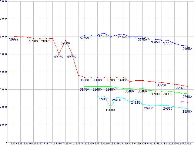 LGA1366 (QPI 4.8GT/s,L3キャッシュ8MB,Quad Core,Hyper-Threading)の最安値推移