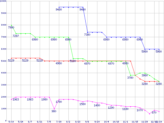 メモリ主要製品(最安値5千円未満)の最安値推移