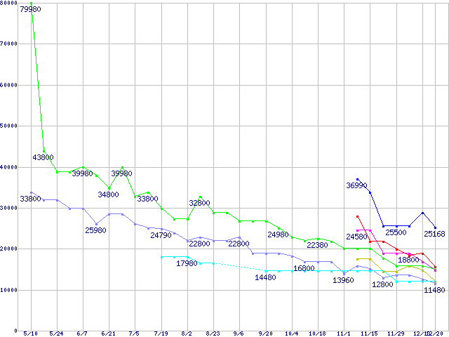 メモリ主要製品(最安値1万円以上)の最安値推移