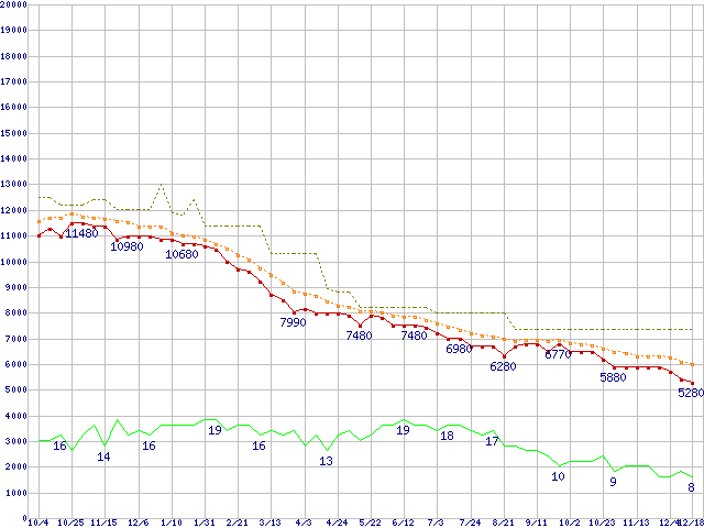 ※このグラフは過去のデータも税率5%相当に調整した税込み相当額のグラフです。 税率変更や、総額表示方式導入(2004年4月)の影響は除いています。 | | | ●凡例 | 最安値 (点線部は販売店未確認 または未調査) | 平均値 | 最高値 | ショップ数 |
