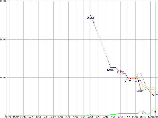 ※このグラフは過去のデータも税率5%相当に調整した税込み相当額のグラフです。 税率変更や、総額表示方式導入(2004年4月)の影響は除いています。 | | | ●凡例 | 最安値 (点線部は販売店未確認 または未調査) | 平均値 | 最高値 | ショップ数 |
