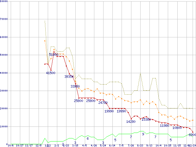 ※このグラフは過去のデータも税率5%相当に調整した税込み相当額のグラフです。 税率変更や、総額表示方式導入(2004年4月)の影響は除いています。 | | | ●凡例 | 最安値 (点線部は販売店未確認 または未調査) | 平均値 | 最高値 | ショップ数 |