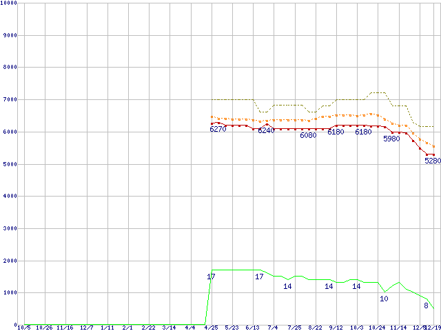 ※このグラフは過去のデータも税率5%相当に調整した税込み相当額のグラフです。 税率変更や、総額表示方式導入(2004年4月)の影響は除いています。 | | | ●凡例 | 最安値 (点線部は販売店未確認 または未調査) | 平均値 | 最高値 | ショップ数 |