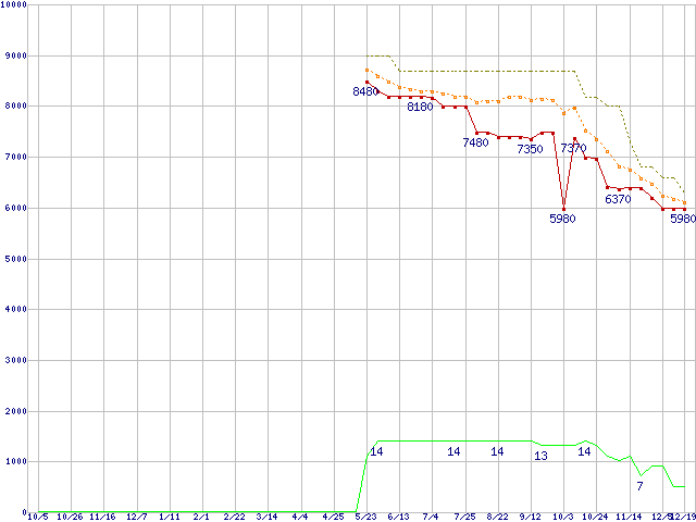※このグラフは過去のデータも税率5%相当に調整した税込み相当額のグラフです。 税率変更や、総額表示方式導入(2004年4月)の影響は除いています。 | | | ●凡例 | 最安値 (点線部は販売店未確認 または未調査) | 平均値 | 最高値 | ショップ数 |