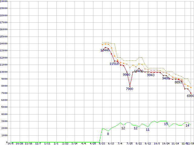 | Athlon X2 5600 (2.9GHz,L2 512KB×2)の価格推移 | | | (2007年10月5日~2008年12月19日) |