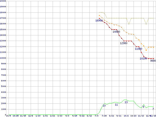 ※このグラフは過去のデータも税率5%相当に調整した税込み相当額のグラフです。 税率変更や、総額表示方式導入(2004年4月)の影響は除いています。 | | | ●凡例 | 最安値 (点線部は販売店未確認 または未調査) | 平均値 | 最高値 | ショップ数 |