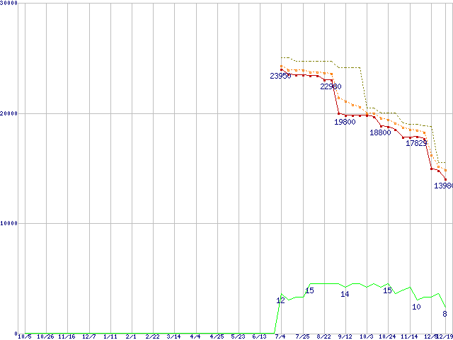 | Phenom X4 9350e (2.0GHz,L2 512KB×4,L3 2MB)の価格推移 | | | (2007年10月5日~2008年12月19日) |