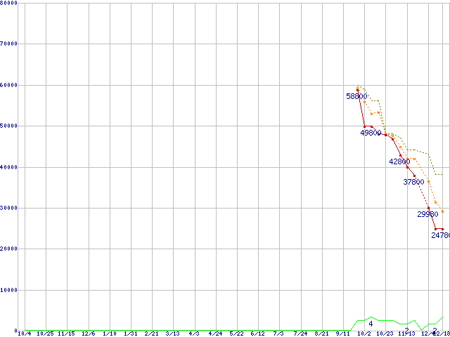 ※このグラフは過去のデータも税率5%相当に調整した税込み相当額のグラフです。 税率変更や、総額表示方式導入(2004年4月)の影響は除いています。 | | ●凡例 | 最安値 (点線部は販売店未確認 または未調査) | 平均値 | 最高値 | ショップ数 |