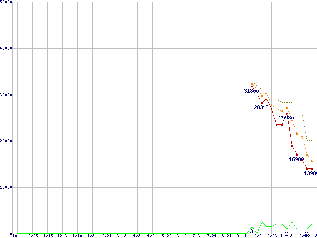 ※このグラフは過去のデータも税率5%相当に調整した税込み相当額のグラフです。 税率変更や、総額表示方式導入(2004年4月)の影響は除いています。 | | | ●凡例 | 最安値 (点線部は販売店未確認 または未調査) | 平均値 | 最高値 | ショップ数 |