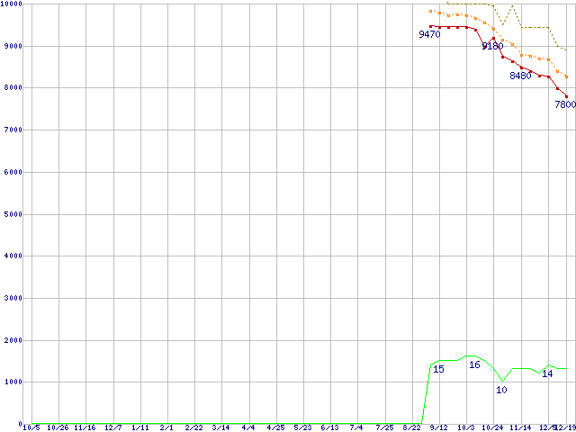 ※このグラフは過去のデータも税率5%相当に調整した税込み相当額のグラフです。 税率変更や、総額表示方式導入(2004年4月)の影響は除いています。 | | | ●凡例 | 最安値 (点線部は販売店未確認 または未調査) | 平均値 | 最高値 | ショップ数 |