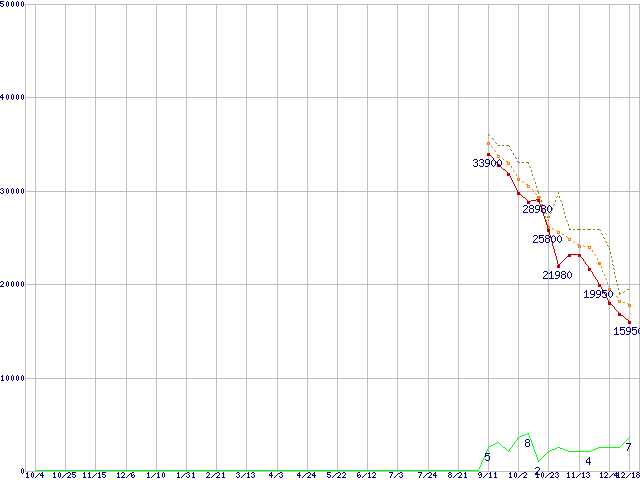 ※このグラフは過去のデータも税率5%相当に調整した税込み相当額のグラフです。 税率変更や、総額表示方式導入(2004年4月)の影響は除いています。 | | | ●凡例 | 最安値 (点線部は販売店未確認 または未調査) | 平均値 | 最高値 | ショップ数 |