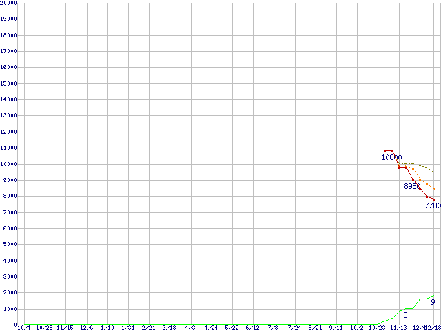 ※このグラフは過去のデータも税率5%相当に調整した税込み相当額のグラフです。 税率変更や、総額表示方式導入(2004年4月)の影響は除いています。 | | | ●凡例 | 最安値 (点線部は販売店未確認 または未調査) | 平均値 | 最高値 | ショップ数 |