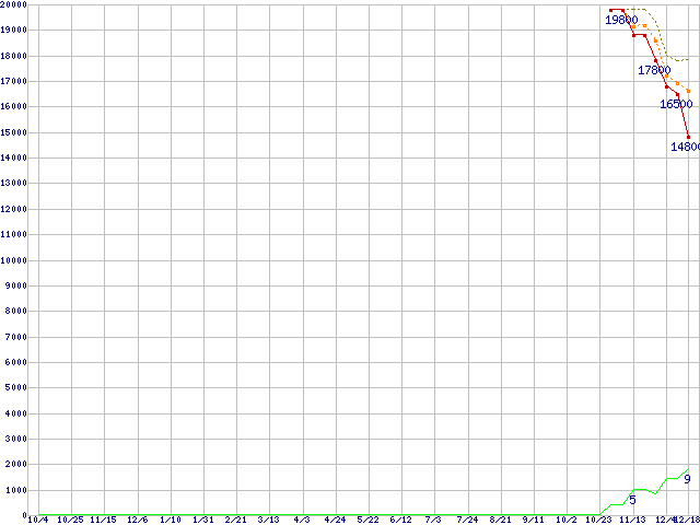 ※このグラフは過去のデータも税率5%相当に調整した税込み相当額のグラフです。 税率変更や、総額表示方式導入(2004年4月)の影響は除いています。 | | | ●凡例 | 最安値 (点線部は販売店未確認 または未調査) | 平均値 | 最高値 | ショップ数 |