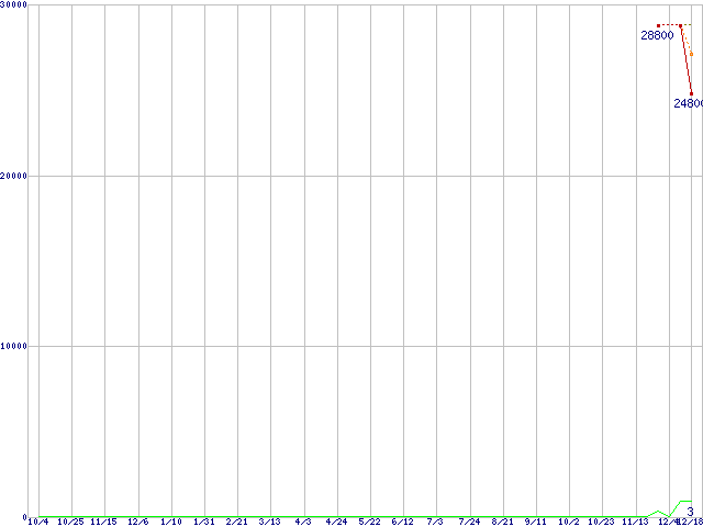 ※このグラフは過去のデータも税率5%相当に調整した税込み相当額のグラフです。 税率変更や、総額表示方式導入(2004年4月)の影響は除いています。 | | | ●凡例 | 最安値 (点線部は販売店未確認 または未調査) | 平均値 | 最高値 | ショップ数 |