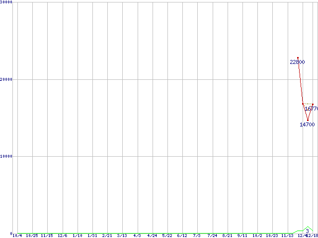 ※このグラフは過去のデータも税率5%相当に調整した税込み相当額のグラフです。 税率変更や、総額表示方式導入(2004年4月)の影響は除いています。 | | | ●凡例 | 最安値 (点線部は販売店未確認 または未調査) | 平均値 | 最高値 | ショップ数 |