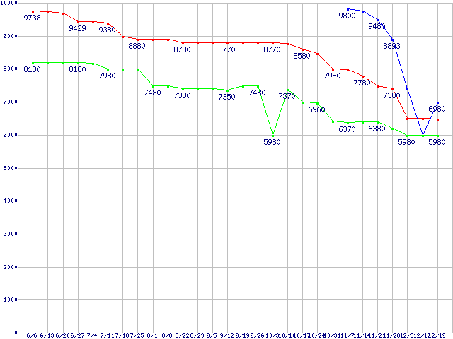 | Socket AM2 (HyperTransport,Dual Core,TDP 45W)の最安値推移 | | | (2008年6月6日~2008年12月19日) |