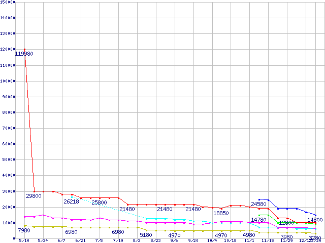 PC3-12800(DDR3-1600) DDR3 SDRAM DIMMの最安値推移