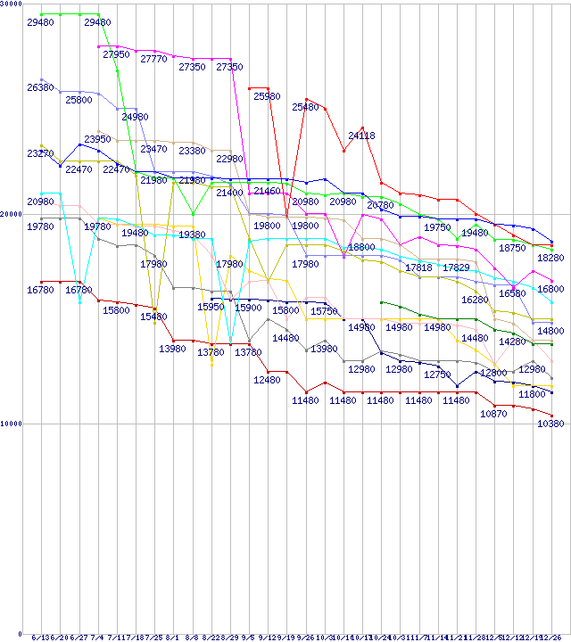 | CPU主要製品(最安値1万円~2万円未満)の最安値推移 | | | (2008年6月13日~2008年12月26日) |