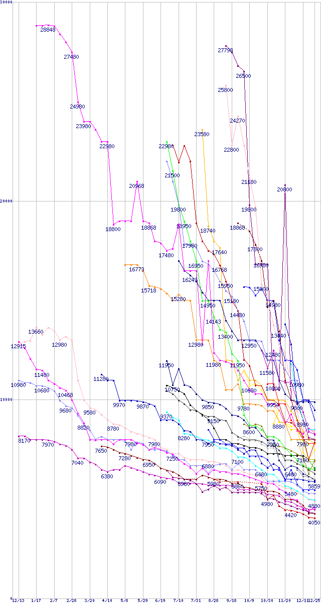 | HDD/SSD主要製品(最安値1万円未満)の最安値推移 | | | (2007年12月13日~2008年12月25日) |