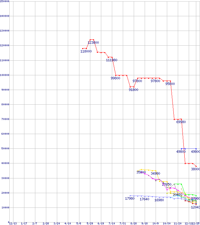 | HDD/SSD 60GB~80GB未満の最安値推移 | | | (2007年12月13日~2008年12月25日) |
