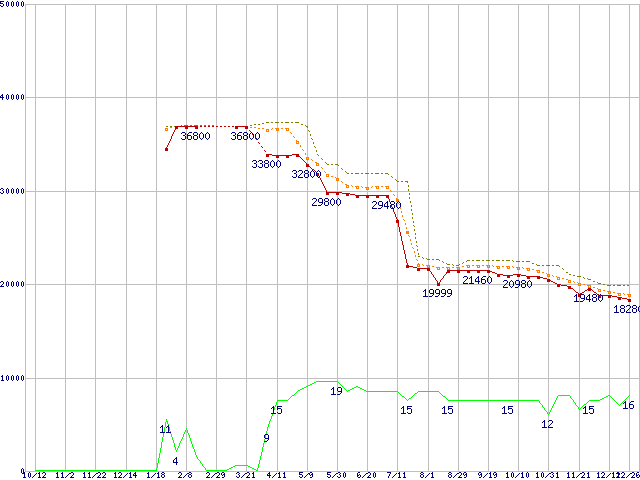 ※このグラフは過去のデータも税率5%相当に調整した税込み相当額のグラフです。 税率変更や、総額表示方式導入(2004年4月)の影響は除いています。 | | | ●凡例 | 最安値 (点線部は販売店未確認 または未調査) | 平均値 | 最高値 | ショップ数 |
